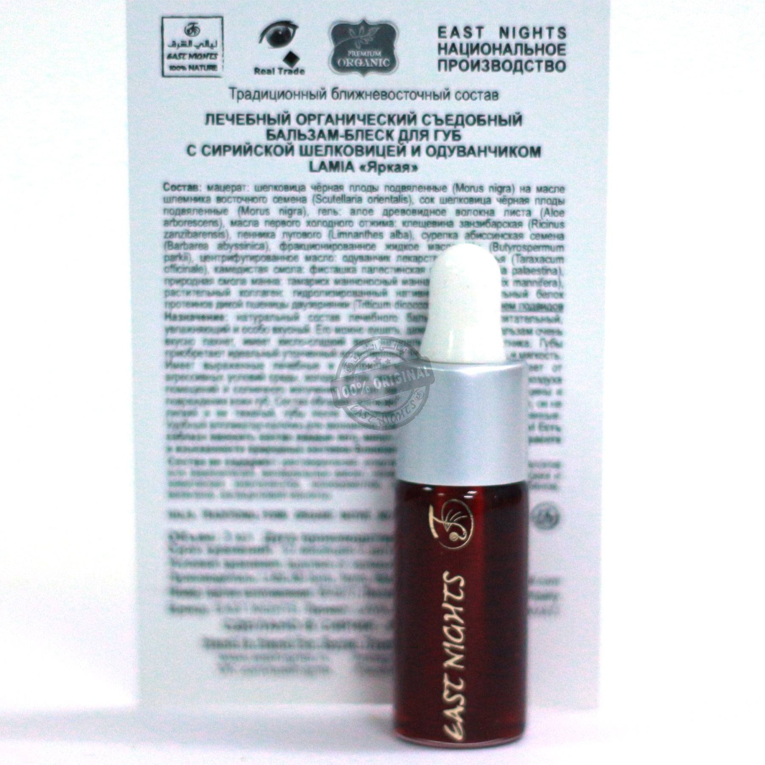 Целебный органический съедобный бальзам-блеск для губ с сирийской шелковицей и одуванчиком Lamia «Яркая» Натуральный состав целебного бальзама-блеска питательный, увлажняющий и особо вкусный! Его можно кушать, даже специально! Бальзам очень вкусно пахнет, имеет кисло-сладкий вкус натурального черного тутника. Губы приобретают идеальный утонченный естественный блеск, шелковистость и мягкость. Имеет выраженные профилактические и целебные свойства, защищает от агрессивных условий среды, холода ветра, механического трения, сухости воздуха помещений и солнечного излучения. Внимание! Есть соблазн наносить состав каждые 5 минут, вызывает привыкание к красоте и изысканности природных составов Ближнего Востока! Мацерат: шелковица черная плоды подвяленные на масле шлемника восточного семена, сок шелковица черная плоды подвяленные, гель алоэ вера древовилное волокна листа, масла первого холодного отжима: клещевина занзибарская, пенника лугового, сурепка абиссинская семена, календула персидская семена, фракционированное жидкое масло ши, центрифугированнное масло: одуванчик лекарственный листья, камедистая смола: фисташка палестинская камедь, природная смола манна: тамариск манноносный манна стебля, растительный коллаген: гидролизованный нативный трехспиральный белок протеинов дикой пшеницы двузернянки Состав не содержит: растворителей, спирта, алкоголя и его следов, аналогов или заменителей, минеральных масел, пигментов, отдушек, синтетических и химических компонентов, консервантов, искусственных баз, парабенов, вазелина, салициловой кислоты.